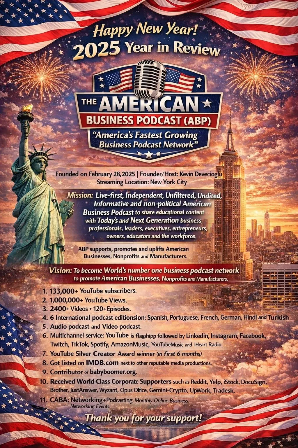 2025 was a successful year for ABP business community. We streamed first-time on February 28, 2025. In less than a year, we gained 135,000+ YouTube subscribers and more than 1 million views. Moreover, we streamed 120+ episodes and produced 2,400+ business videos. That is Why ABP is America's fastest growing educational business podcast network. ABP is more influential than ever before in American and Global Business Markets. ABP is growing strong. Thank you for your interest and for your support! Click HERE to read the press release on Associated Press (AP) website about achievements of ABP.